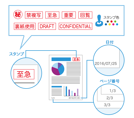コピー時に、「禁複写」などのスタンプをつけて書類の重要性を知らせることができます。