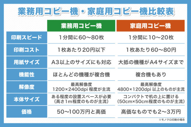 そもそも業務用のコピー機と個人で使用する家庭用コピー機にはさまざまな違いがあり、それぞれメリットも異なります。 業務用コピー機が優れているポイント、家庭用コピー機が優れているポイントに分けて、それぞれ…
