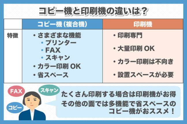 コピー機と印刷機、この2つは名前だけを見ると同じようなものに思えますが、実際にはこの両者には大きな違いがあります。「どちらを選んでも同じようなものだろう」と軽く考えて導入を決めてしまうと、あとでその選…