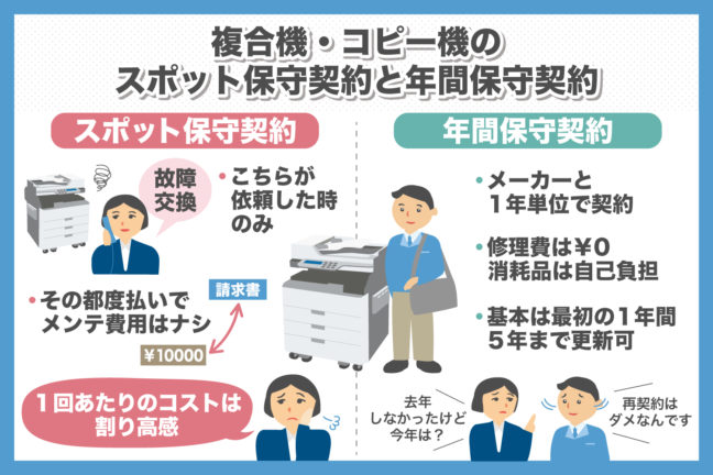 複合機・コピー機の消耗部品の交換や修理・メンテナンスなどのための「保守契約」にはいくつかの種類がありますが、ここではスポット保守契約と年間保守契約について、それぞれどういう保守契約なのか、両者の保守契…