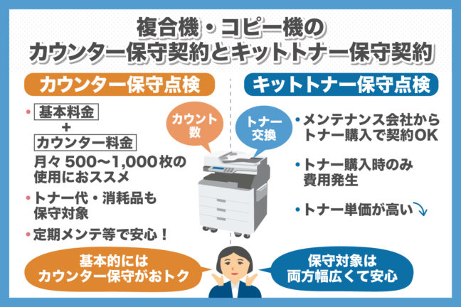 複合機・コピー機の消耗部品の交換や修理・メンテナンスなどのために結ぶ保守契約には、いくつかの種類があります。ここでは「カウンター保守契約」と「キットトナー保守契約」について、それぞれの特徴や両者の違い…