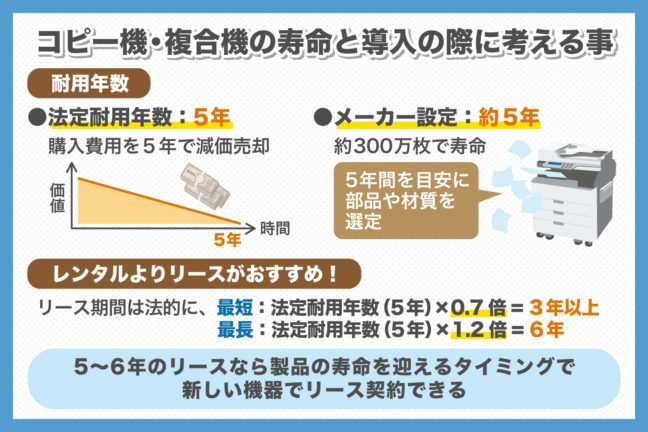 コピー機・複合機には耐用年数が定められています。今回は、コピー機・複合機の法定耐用年数およびメーカーが設定する耐用年数に加え、耐用年数を踏まえたうえでのコピー機・複合機のおすすめ契約方法もご紹介します