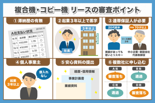 コピー機・複合機のリースは、申し込めば借りられるというものではなく、事前に審査が行われます。 審査の基準や通りやすさはリース会社ごとに違ってきますが、法人・個人事業主ともに通過率を上げるポイントがある